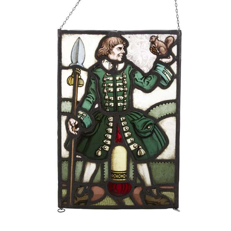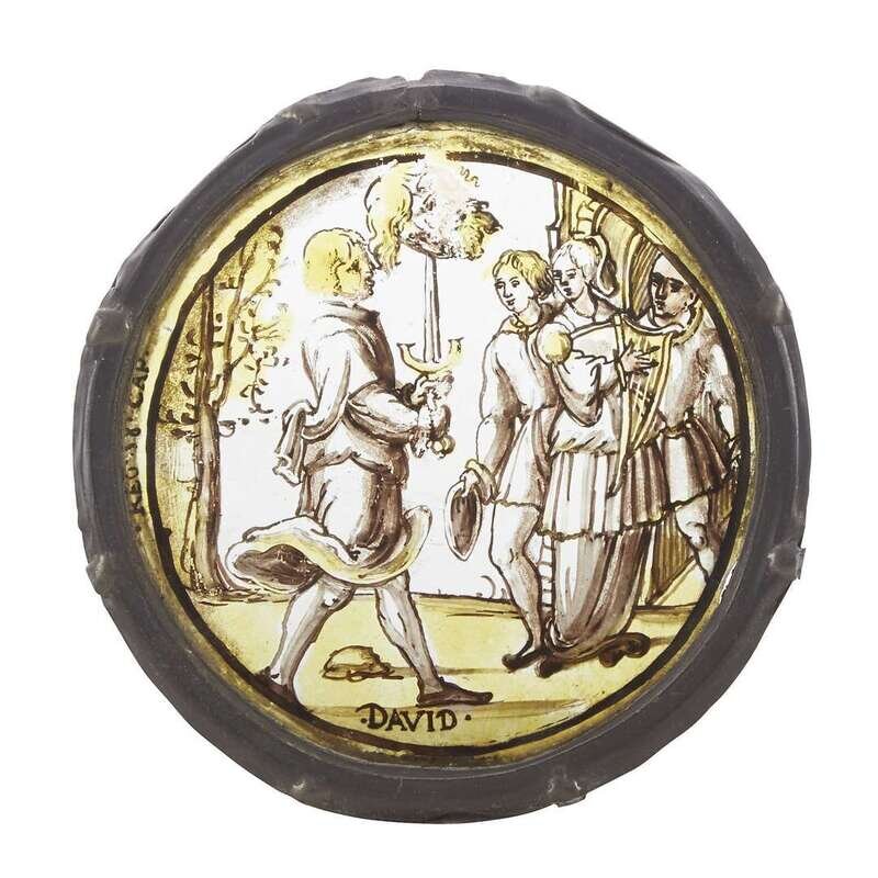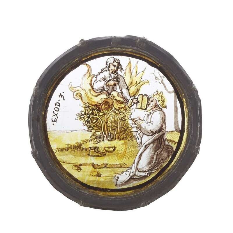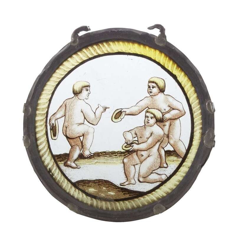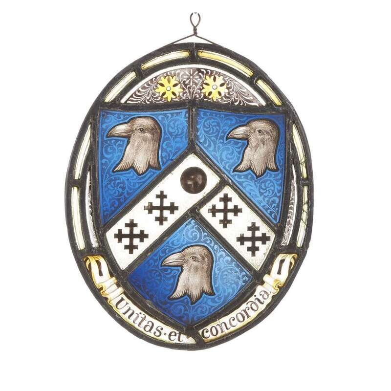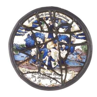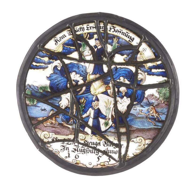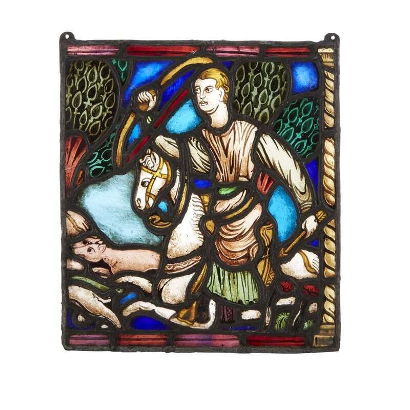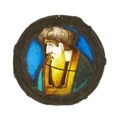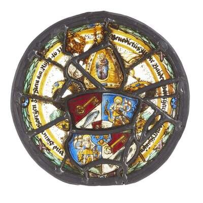 Comprising two panels and seven roundels of religious and heraldic subjects. (9).