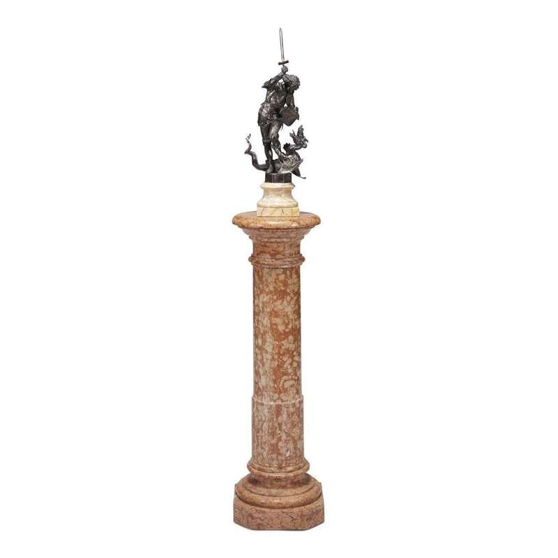 Depicting Saint George slaying the dragon and mounted to circular marble base, sold together with stop-fluted breche marble pedestal. (2).