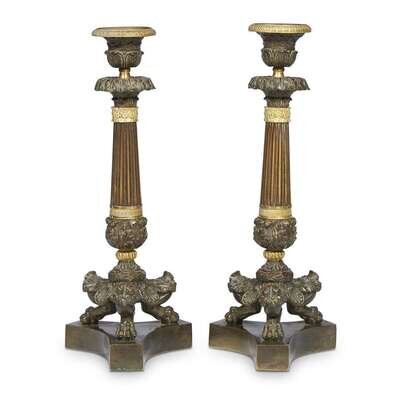 A pair of Louis Philippe gilt- and patinated-bronze candlesticks second quarter 19th century