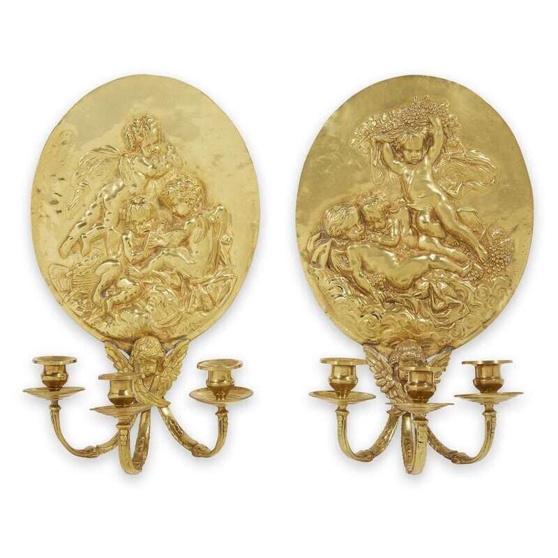 Each with oval backplate relief-decorated with putti issuing three candlearms. (2).