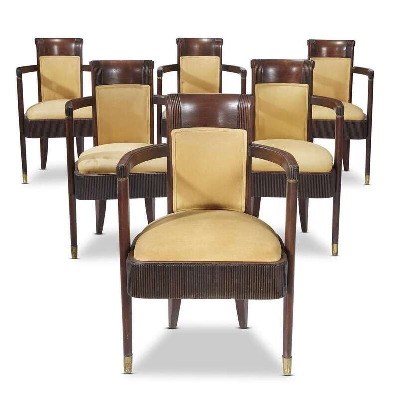 From the liner's First Class Dining Salon, with scrolling seat rail with reeded borders, and downswept arms above gilt-brass spacers, the shaped reeded seat rail on sabre legs, the front two terminating in gilt-brass sabots, the seatrails stamped by manufacturer Neuveu-Nelson, originally upholstered in Aubusson tapestry, now reupholstered in velours d'or. (6).