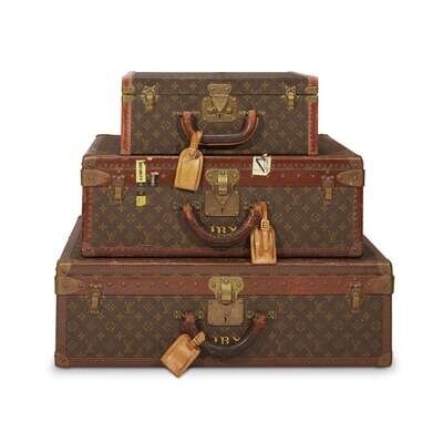 Each monogrammed "B.J.Y.", the largest with serial number 911822 and the two largest with original removable inserts; sold together with a Louis Vuitton garment bag. (4).