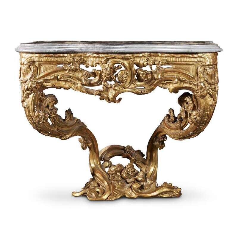 With serpentine moulded Africano marble-inset bleu turquin marble top, above a pierced frieze of C-scrolls, rocailles, and roses suspended on two heavily undulating naturalistic vine-form legs.