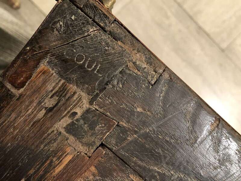 The serpentine Eretria red marble top above bombé case with three short over two long banded drawers, all lined in pink and ivory silk brocade, the whole raised on four French feet; stamped "COULON."