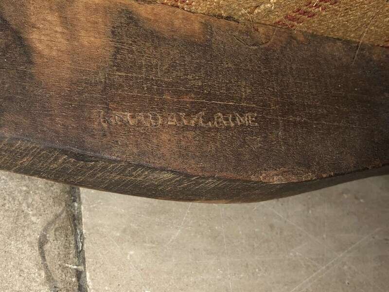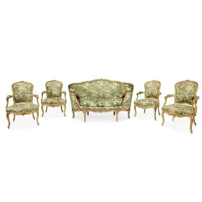 The shaped and channel-moulded crestrail carved with flowers and issuing integral armrests with manchettes encircling a cushion seat; the seatrail similarly carved and raised on four volute feet; stamped "R. NADAL-LAINE."