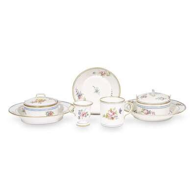 With integral stands, each with gilt-enriched blue border and allover decorated with hand-enameled floral sprays; one with blue underglaze Sèvres mark and date code H for 1760, the other with red underglaze Sèvres mark and date code S for 1771; sold together with a chocolate cup and saucer and demitasse cup of conforming pattern and similar age. (4).
