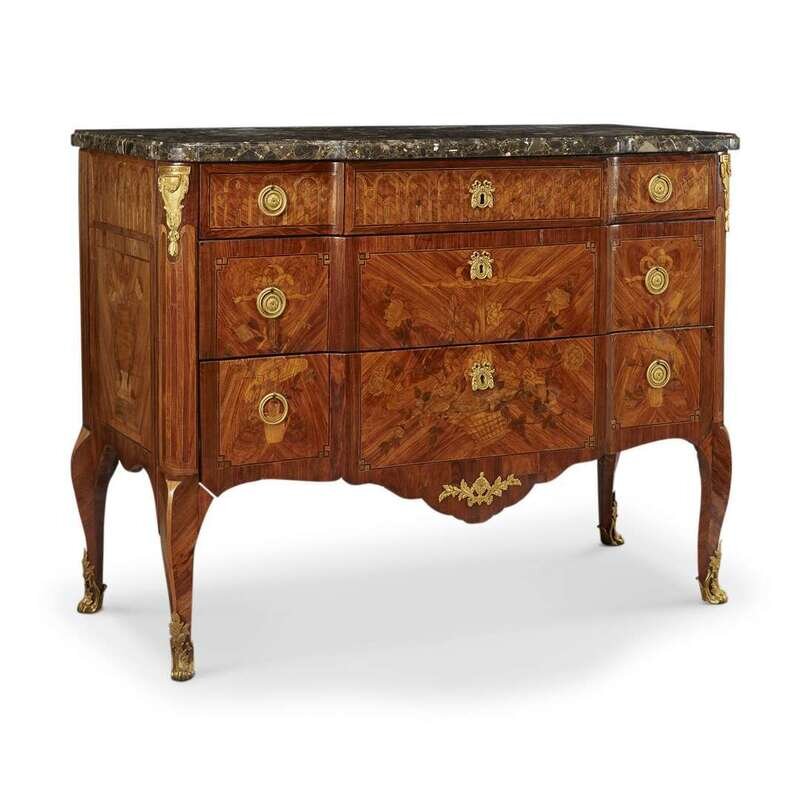 A Louis XV/Louis XVI transitional ormolu-mounted marquetry and parquetry acajou, kingwood, and fruitwood commode René Dubois (French, 1737-1788), circa 1770