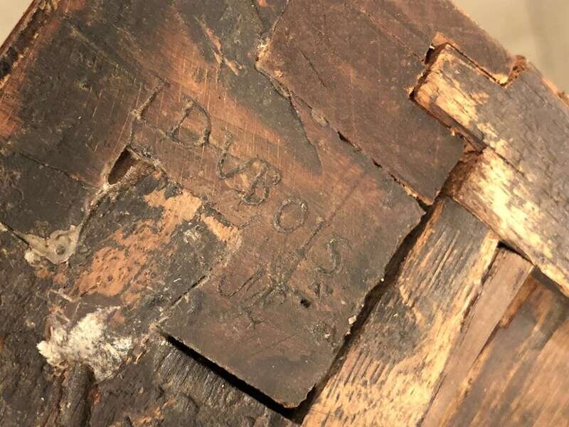 The Breccia di Tivoli marble top above three arcaded frieze drawers above two long drawers decorated with floral marquetry baskets and flanked by rounded trompe l'oeil fluted corners, the sides similarly decorated; raised on four cabriole legs terminating in sabots; stamped "I DUBOIS" and with JME stamp.