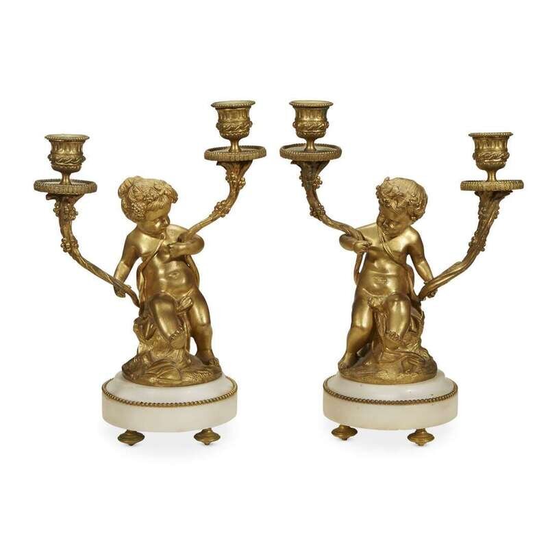 After the model by Claude Michel Clodion (French, 1738-1814), each in the form of a bacchic putto holding aloft two vining candlearms; each raised on round white marble base on four compressed toupie feet and signed in cast at rear "Clodion." (2).