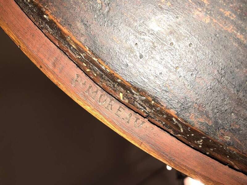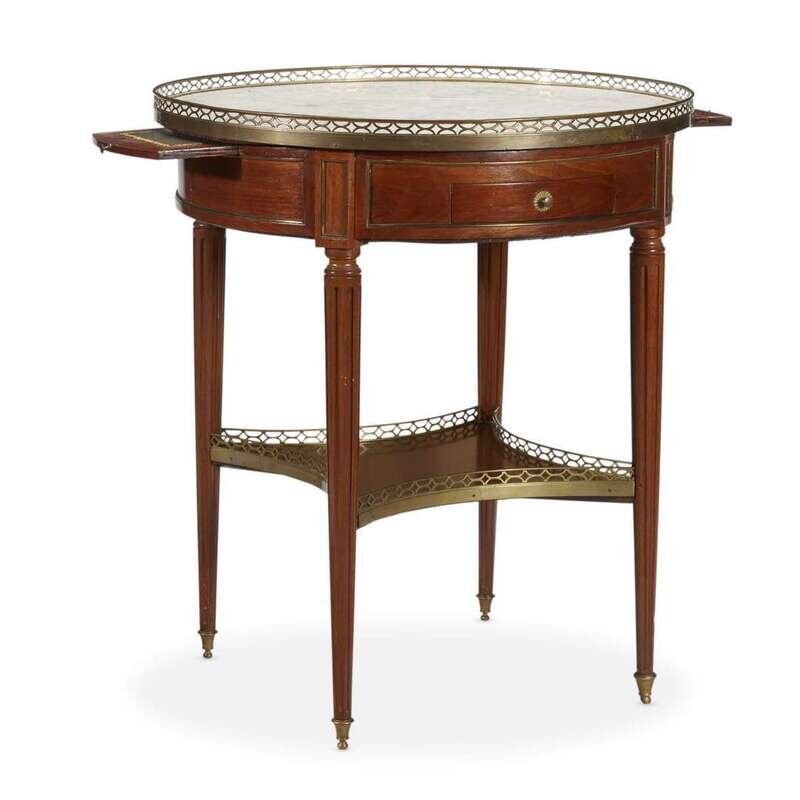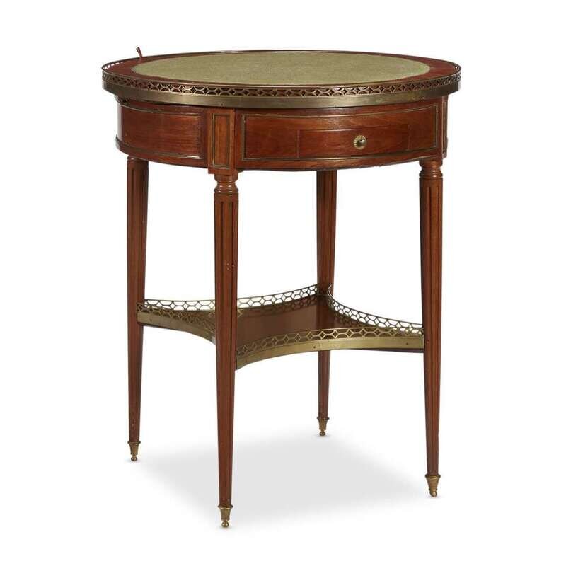 The top with circular removable wood and gilt-tooled leather writing insert over a Carrara marble top with ormolu gallery; the drum with two side drawers and one extending writing surface; the whole raised on fluted tapering legs united by a lower shelf and terminating in toupie feet; stamped to underside "P+MOREAU."