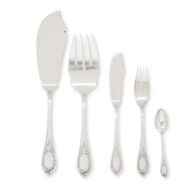 In the Louis XV style and comprising a fish slice and serving fork, together with twelve fish forks, twelve fish knives, and twelve demitasse spoons. (38).