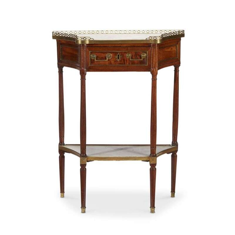 The trapezoidal Carrera marble top with brass gallery above a brass-banded frieze drawer; raised on four fluted cylindrical legs united by a trapezoidal Carrera marble lower shelf.