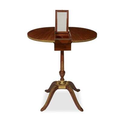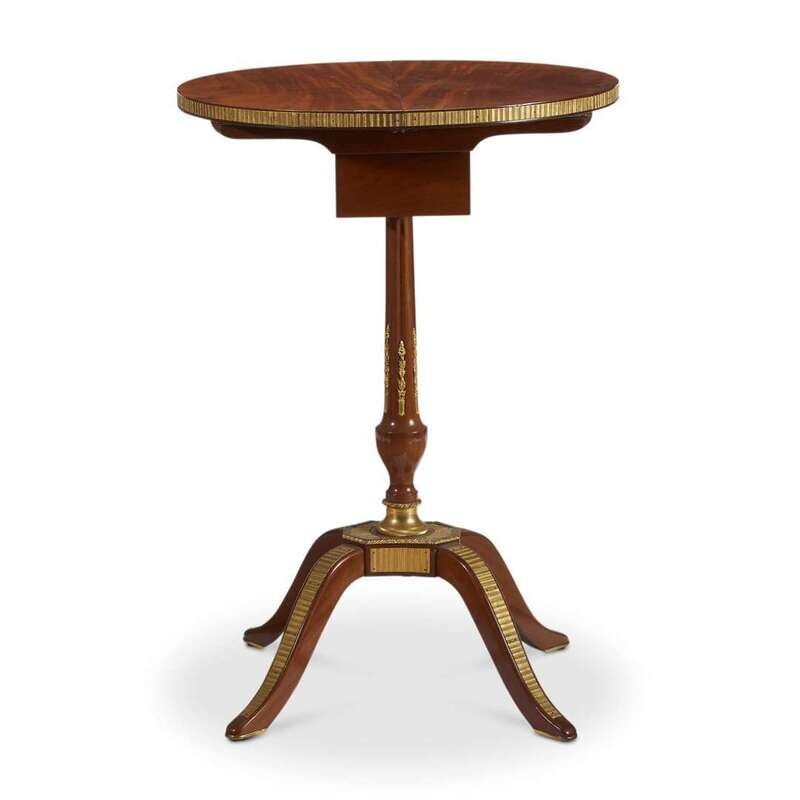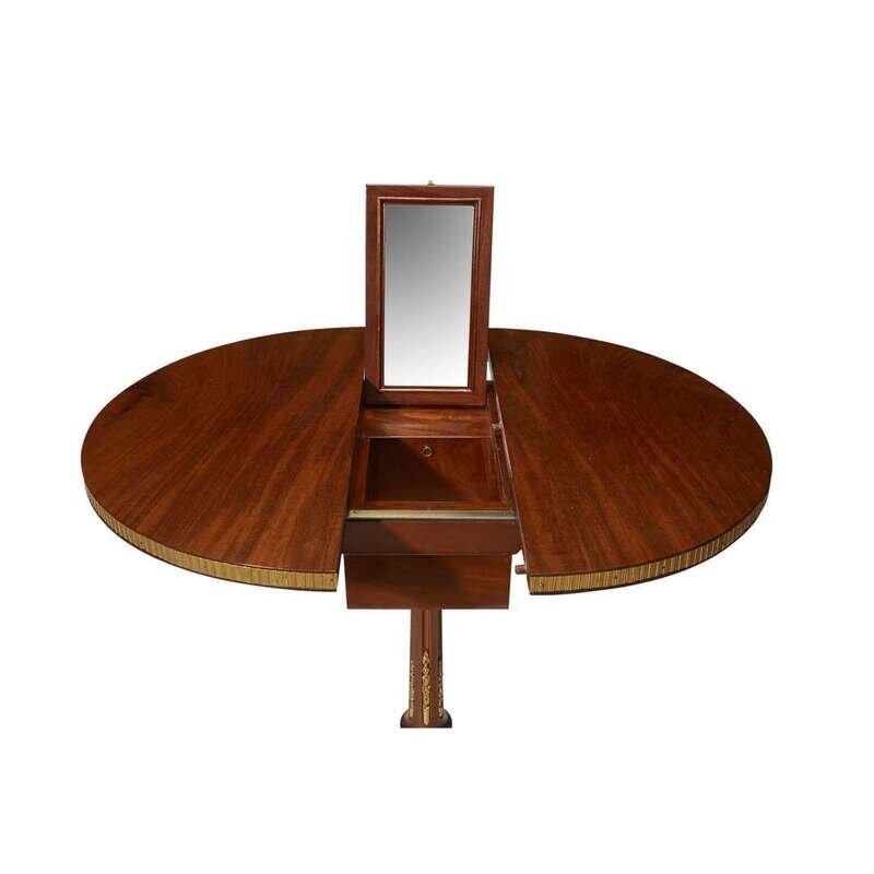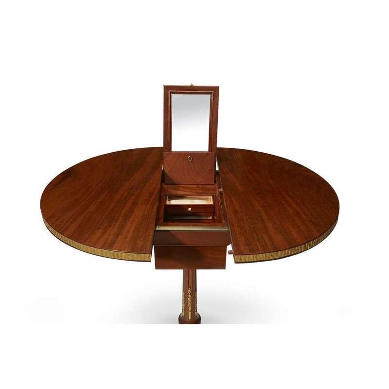 The circular sliding top enclosing a hidden compartment housing a hinged mirror, a cubby hole, and three secret drawers, raised on a fluted baluster pedestal above four outswept feet applied with fine ormolu strapwork; stamped "J*F*LELEU" and with JME stamp.
