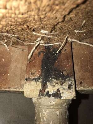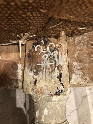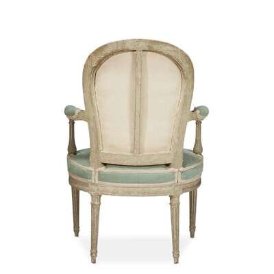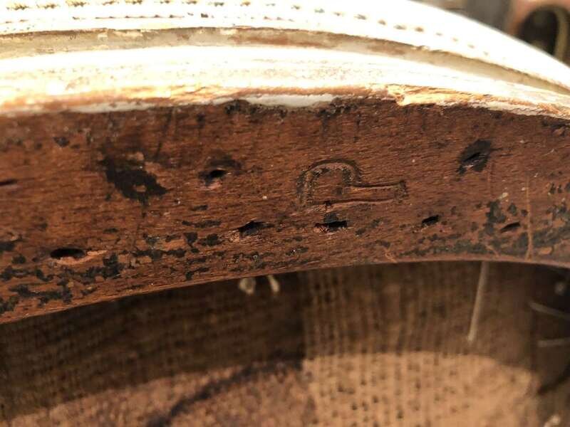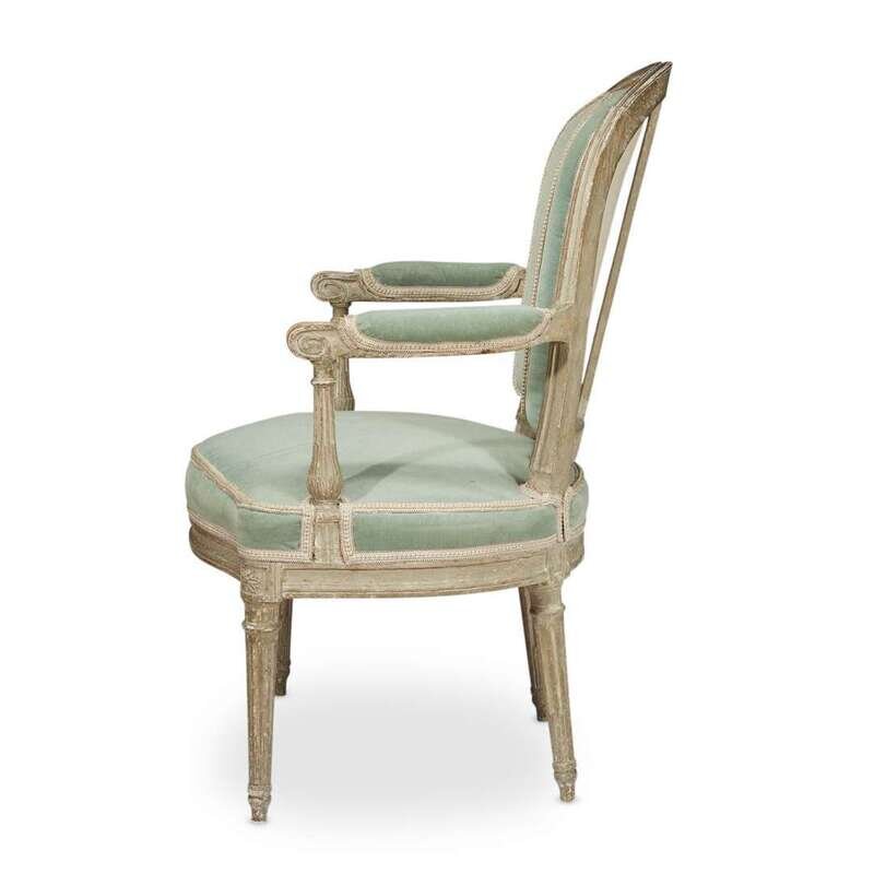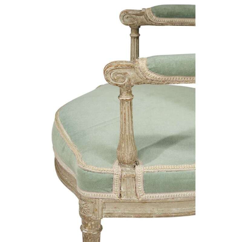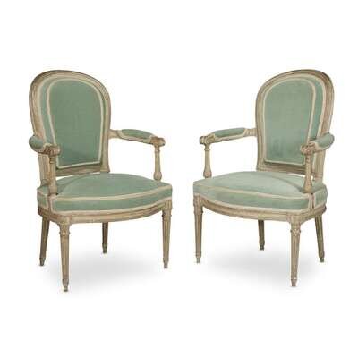 With round channel-moulded backrest issuing straight scrolled arms with manchettes above serpentine U-form seat, the conforming seatrail above four patera-headed fluted tapering legs on toupie feet; each stamped "P" to underside of seatrail and to interior corner of rear leg with anchor surmounted by crown or fleur-de-lys, possibly for Château de Chanteloup; now upholstered in eau-de-nil silk velvet with cording in period taste. (2).