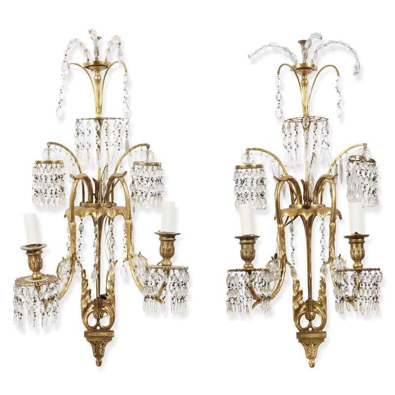 A pair of Neoclassical style crystal-mounted ormolu two-light appliques possibly Baltic, early 20th century