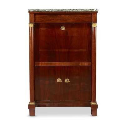 With rectangular serpentine verde marble top above a torus drawer above fall front flanked by columns opening to reveal a fitted interior with a large cubby over an assortment of six drawers above a burgundy gilt-tooled writing surface; the lower section with two cabinet doors enclosing shelves; the whole raised on four block feet.