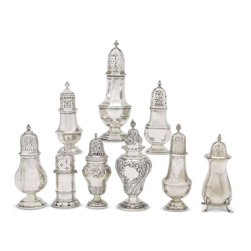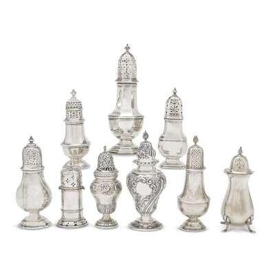An assembled collection of nine English sterling silver casters various makers, late 19th/early 20th centuries