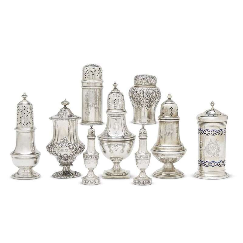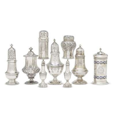 Of various forms, including three with cobalt glass liners, comprising a pair by Gorham Mfg. Co.; one each Howard & Co., Bigelow Kennard & Co., Blair & Crawford, Reed & Barton, Dominick & Haff; and one marked "STERLING" with no associated hallmark. (9).