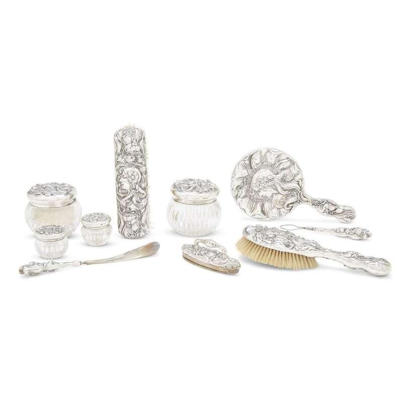 An American sterling silver-mounted Art Nouveau ten-piece dressing set Unger Brothers, Newark, New Jersey, early 20th century