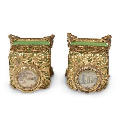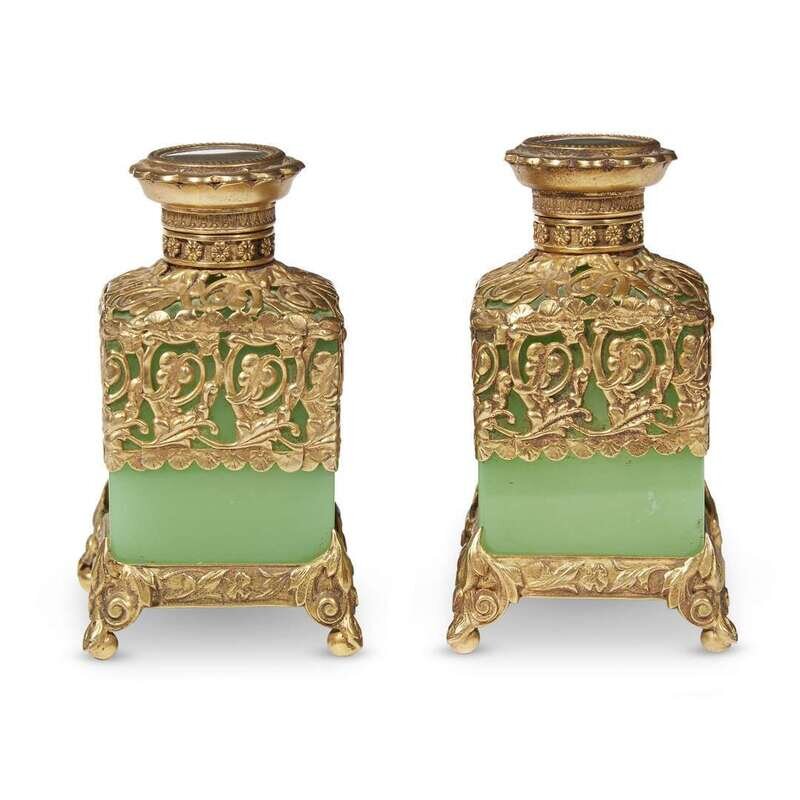 A pair of ormolu-mounted green opaline glass scent bottles 19th century