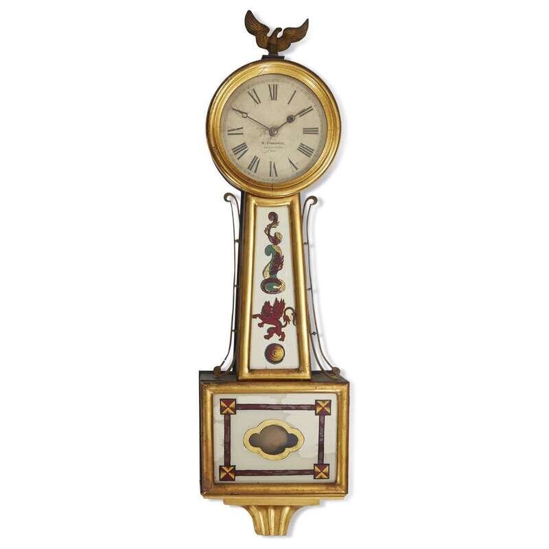 A late Federal verre églomisé parcel-gilt banjo clock W. Goodwin, North Attleboro, MA, 19th century