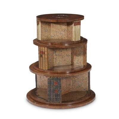 The banded calamander top raised on a brass inlaid rosewood base with four outscrolled legs and brass lion-paw casters; sold together with a revolving tabletop bookcase surmounted by a globe. (2).