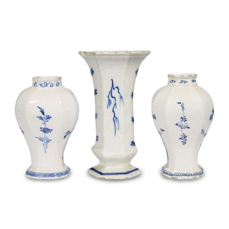 An assembled Dutch Delft three-piece garniture de Klauw, 18th century