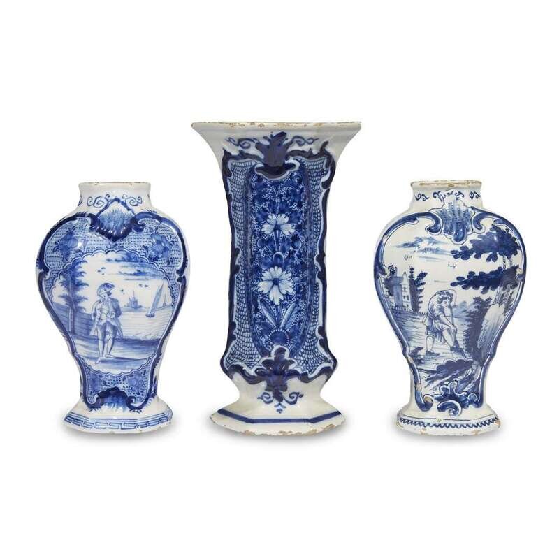 Comprising two octagonal baluster vases with figures of the sea trade, and a hexagonal floral-decorated beaker vase; all with "De Klauw" marks, the baluster vases also marked "180" and the beaker vase "19 1/2 0." (3).