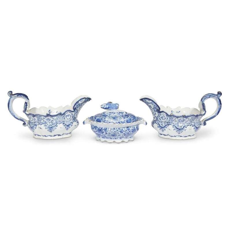 Each of lobed oval form with wave-moulded edge and prominent spout and scrolled handle issuing from watersplash, the underside with mark for Johan Verburg or Jan Van der Buergen, foreman of De Grieske A, and marked "2 1/2;" sold together with a similar salt cellar with fish-form knop and mark "P" below dot. (3).