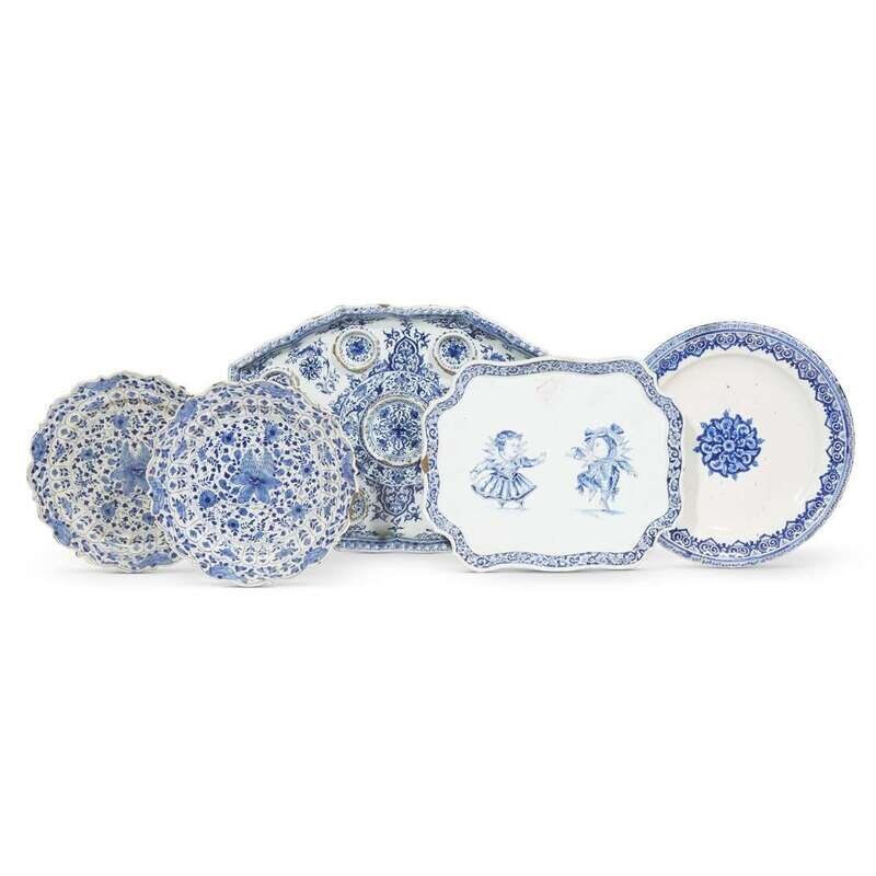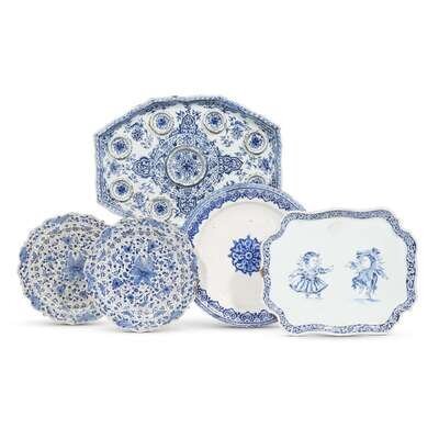 Comprising a pair of millefiori plates with scalloped edge, with maker's cypher possibly IB; an octagonal salt tray with maker's cypher AK possibly for Albertus Kiell of De Witte Ster; a shaped tray depicting Punch and Judy, with maker's cypher EK; and a plate with moulded edge, possibly French and with maker's mark M. (5).