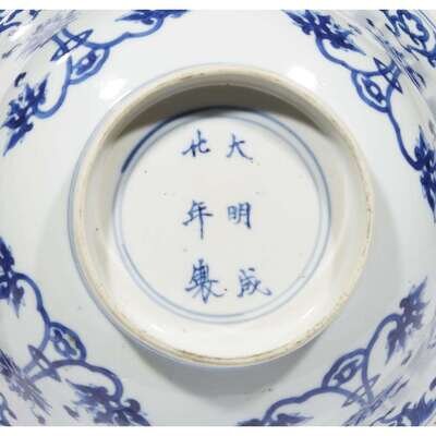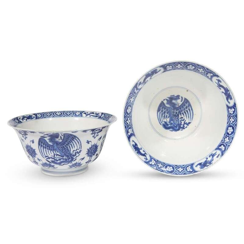 A pair of Chinese blue and white "phoenix" bowls Cheng Hua marks, Kangxi Period