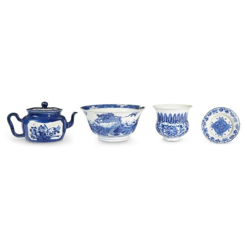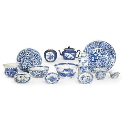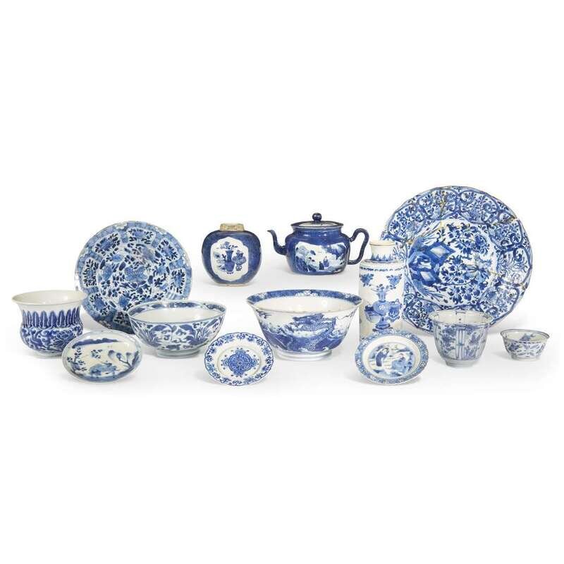 A group of sixteen assorted Chinese blue and white porcelain dishes, bowls, and vases 17th-18th centuries