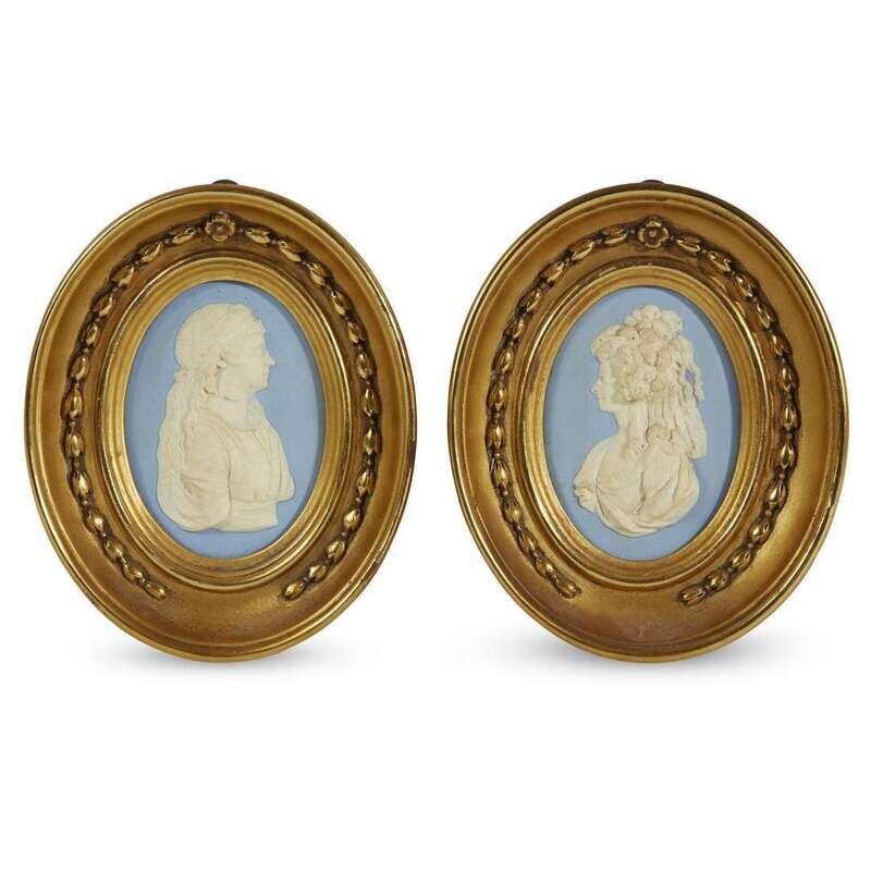 Depicting the Comtesse du Barry and the Princesse de Lamballe, each housed in giltwood frame and with incised title and impressed "WEDGWOOD" mark to verso; the Comtesse du Barry with additional "Made in England" sticker. (2).
