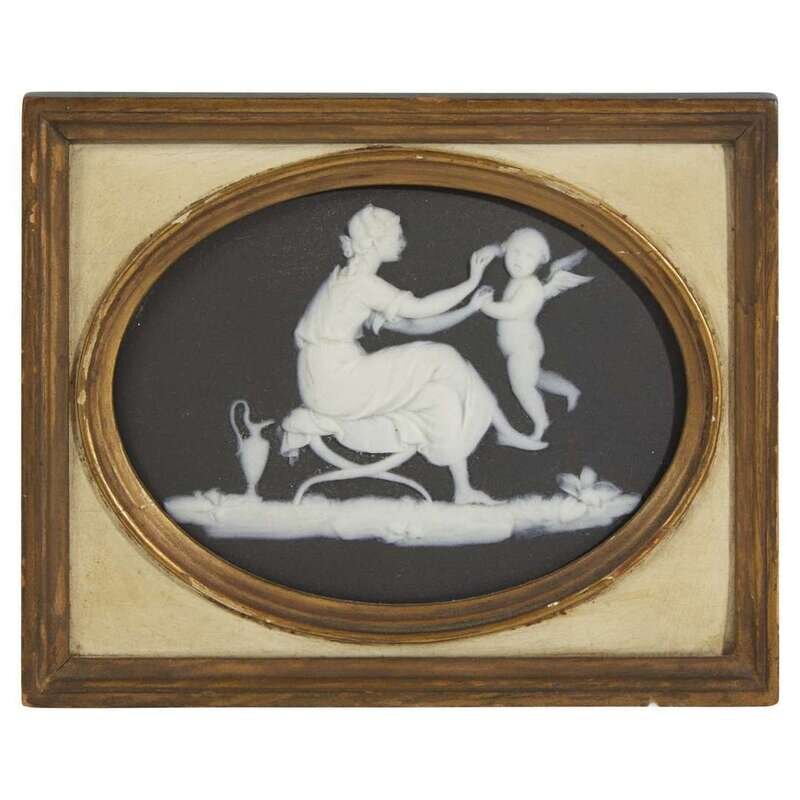 Depicting an allegory of motherly love, impressed "WEDGWOOD" to verso and housed in gilt and white-painted frame with retail label for Vogt & Holmes Art Dealers and Fine Framing, Baltimore.