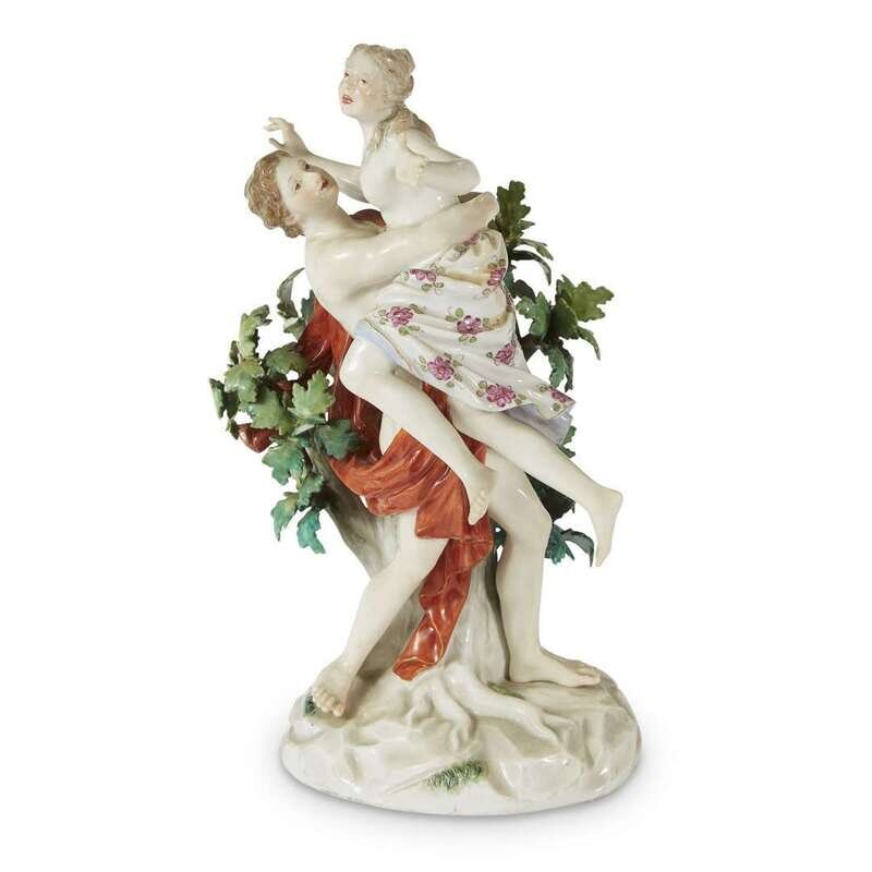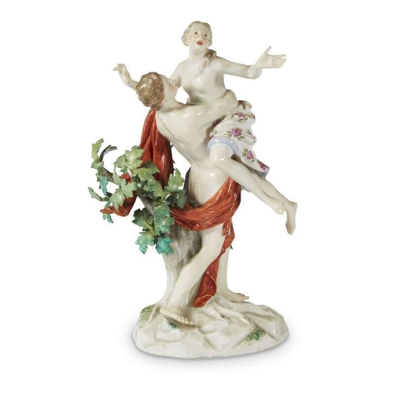 Depicting Pluto in vermilion drapery restraining a partially clothed and distressed Persephone, standing on a rocky ground in front of a tree; with blue underglaze crossed swords mark to underside, incised number "990", impressed number "51", and painted number "48" to base.