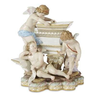 Modeled with three putti standing, kneeling, and seated about a Corinthian architrave brandishing attributes of architecture, the lobed base modeled with bound wreaths and a Vitruvian scroll band; with blue underglaze crossed swards mark to underside with incised number "6" and impressed number "26" with further mark "41."