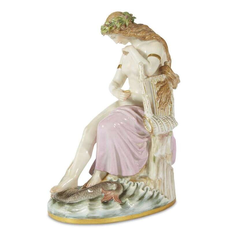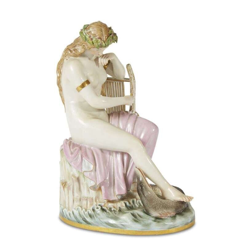 After the model by Ludwig Schwanthaler (German, 1802-1848), depicting Lorelei at rest leaning on her lyre and looking at a gamboling dolphin at her feet, polychromed and parcel-gilt; with blue underglaze crossed sword mark, incised model number "N 100", impressed number "58", and painted number "47."