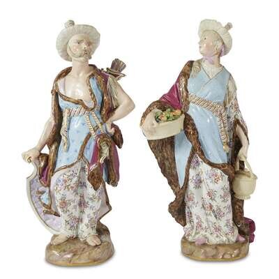 After the models by Friedrich Elias Meyer (German, 1723-1785), the lady with baskets and fruit, the man with shield, quiver, and bow; each marked to underside with blue underglaze crossed swords marks, the lady with incised mark "J.64" and "85", the man with illegible incised marks and impressed number "69." (2).