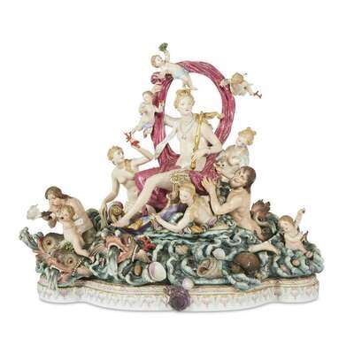 After the 1772-1774 model by Johann Joachim Kändler (German, 1706-1775), depicting the wife of Poseidon and goddess of the sea, Amphitrite, borne aloft on the waves by surrounding naiads, sea creatures, and putti, on a shaped base modeled with shells and nautical reliefs.