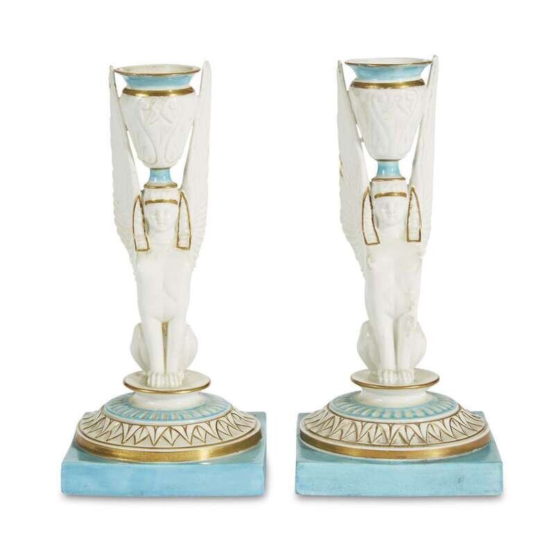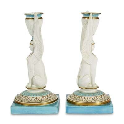 In the form of seated sphinxes upholding incised candlemounts above leaftip-modeled socles on square bases, decorated in turquoise and parcel-gilt. (2).