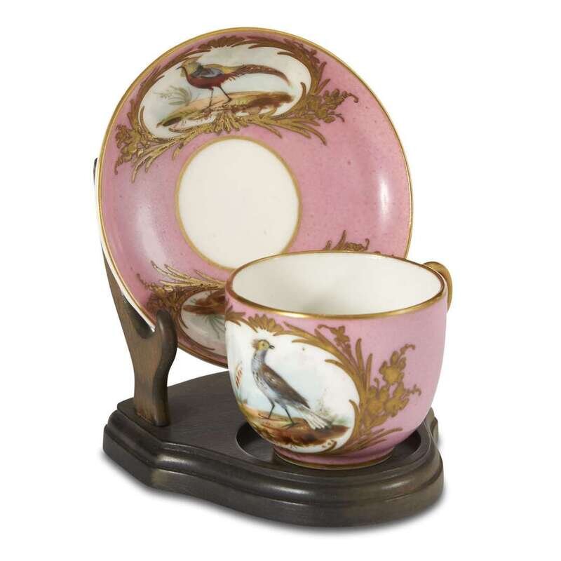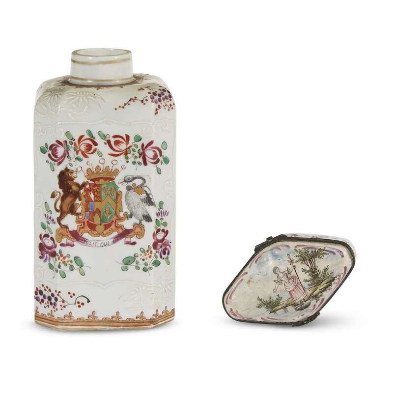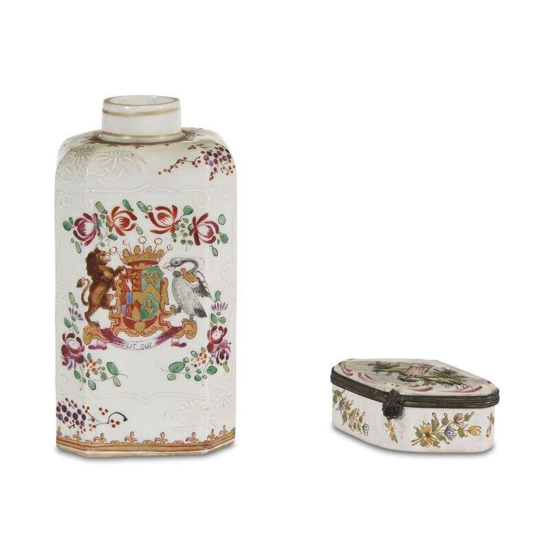 Comprising a Meissen style lozenge-form enamel snuffbox painted to lid with a provincial maiden, with black pseudo-Meissen crossed swords mark to underside; a Samson Chinese export style canister in the famille rose palette decorated with a pseudo-armorial and with pseudo Chinese marks to underside; an a Sèvres style rose Pompadour cup and saucer decorated with pheasants, the undersides with blue overglaze pseudo-Sèvres mark with initial "LF." (4).
