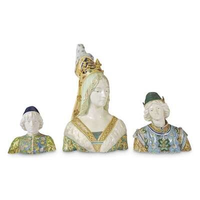 Both marked "AMF" to underside; sold together with a large Italian maiolica bust of a Renaissance maiden, with unknown maker's mark "A" within a shield and numbered "569" to underside. (3).