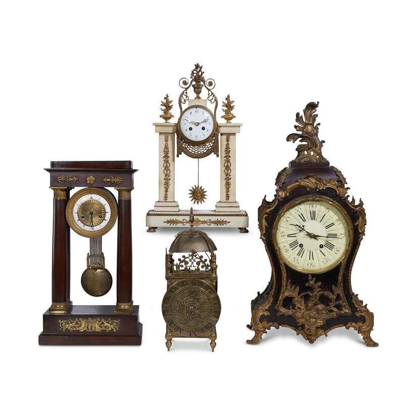 Of typical form, with sun-in-splendour pendulum, the works stamped with Samuel Marti and Medaille Bronze pastilles.