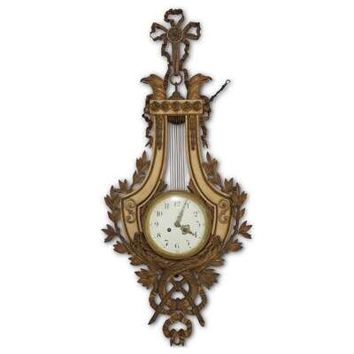 Lyre form, suspended from a ribbon-tied mount and headed by a pair of eagles, the white enamel dial unsigned; the movement stamped with Samuel Marti 'Medaille d'Argent - 1889" pastille and impressed "MADE IN FRANCE/PARIS."
