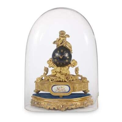 In the form of a globe surmounted by a putto with the attributes of love, above roiling clouds on a classical base in the Louis XVI taste centering an enamelled porcelain plaque; the works with Japy Frères 'Grand Medaille' pastille, the case stamped "P.H. Mourey", the movement with hourly strike and original silk suspension, together with original base and glass dome.