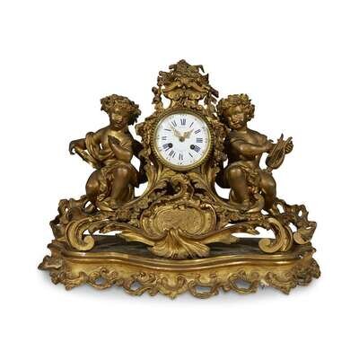 The white enamel dial signed "Richond Fnt." and "Blvd Montmartre 11/Paris" with blue Roman numerals and finely cast hands, with original spring suspension and works; the ormolu figural case an allegory of music depicting two putti with lyre and tambourine, accompanied by original giltwood and gesso rococo base.