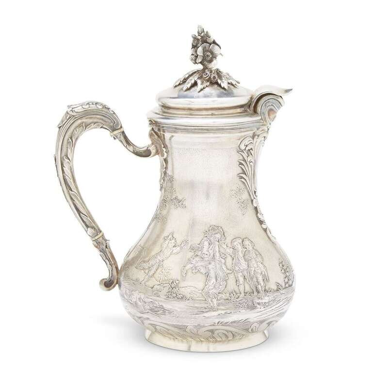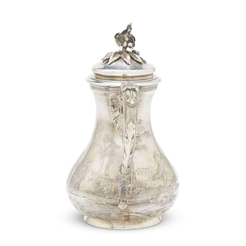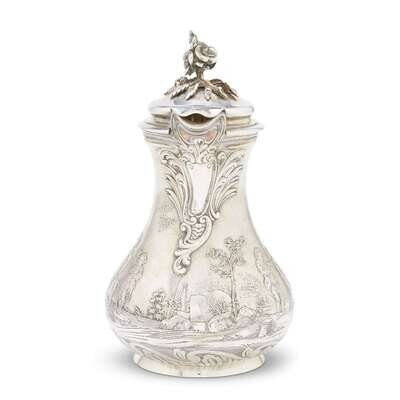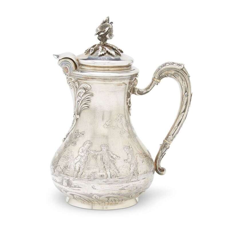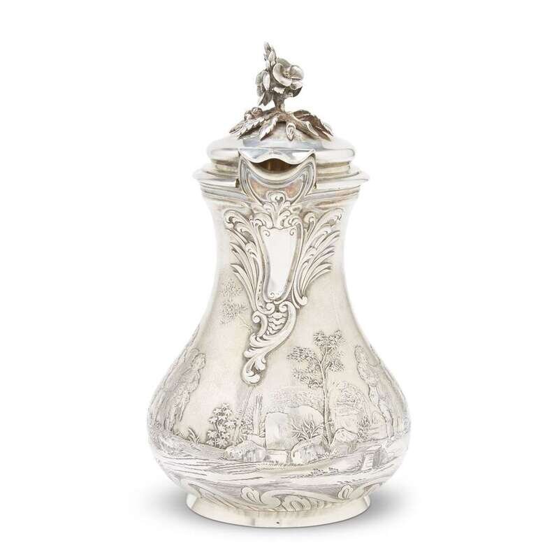 The baluster body very finely cast and etched with pastoral scenes of frères jouant beneath undulant spout enhanced by a cartouche of imbricated rocailles, watersplashes, and reeds, and mounted with foliate-cast scrolled handle; with gilt-washed interior enclosed by domed cover surmounted by elaborate finial in the form of flowering branches; the base etched with waves and rocailles, the underside engraved "Fic. Boucheron/Paris."
