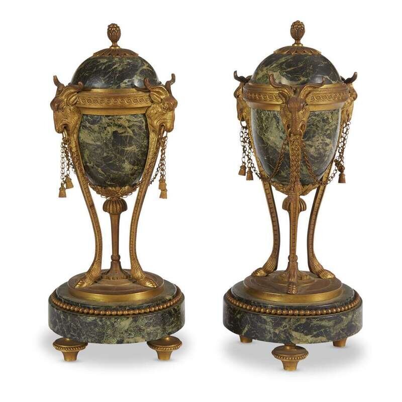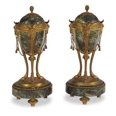 A pair of Louis XVI style gilt-bronze mounted Serpentine marble cassolettes late 19th century