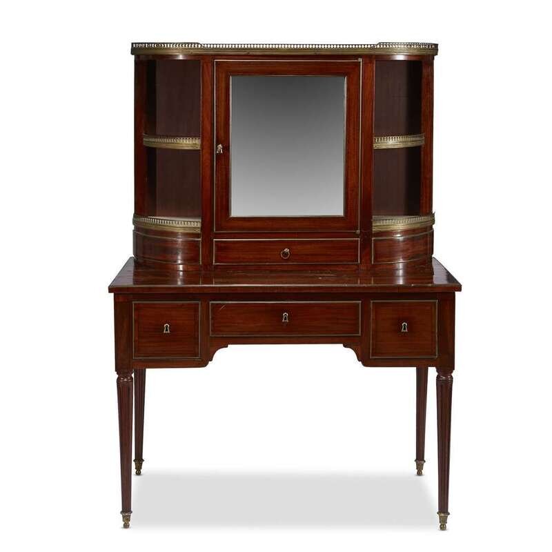 The demi-lune top surmounted by a galleried mirrored surface above a mirrored cabinet door enclosing shelves over a single frieze drawer; the rectangular desk above three further shelves; the whole raised on fluted tapering legs with toupie feet.