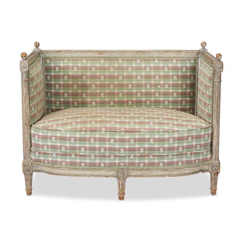 Rectangular, the straight back and sides with moulded frame, upholstered in pink and green madras.